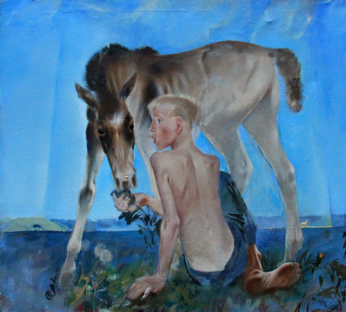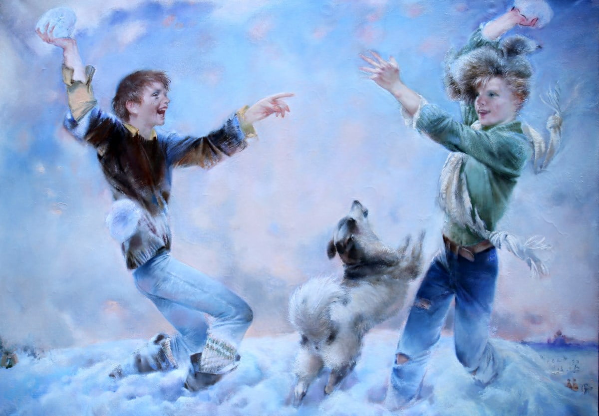 Тема детства занимала важное место в творчестве живописца. Картина «Стригунок» рассказывает о трогательной дружбе мальчика с жеребёнком. Более сорока лет Олег Марушкин писал картину «Игра в снежки» (1980-2020) бесконечно возвращаясь к ней и постоянно внося изменения. Азарт игры и красота движения завораживали мастера. Для художника важно было рассказать о солнечном, чистом мироощущении детства с его бесконечностью времени, теплотой и добротой, открытостью миру и высоким чистым голубым, всегда весенним небом. Он создавал свой идеальный мир — утраченный рай — и наполнив его классической красотой, в которой есть что-то ангельское и бестелесное.