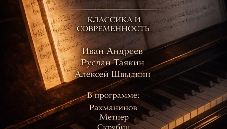 В исполнении лауреатов международных конкурсов, пианистов - Ивана Андреева, Руслана Таякина и Алексея Швыдкина прозвучат шедевры русской фортепианной музыки, самые известные Музыкальные моменты С. В. Рахманинова, Соната-воспоминание Н. К. Метнера, сочинения А. Н. Скрябина, а также новые опусы молодых композиторов М. Логинова и Р. Таякина